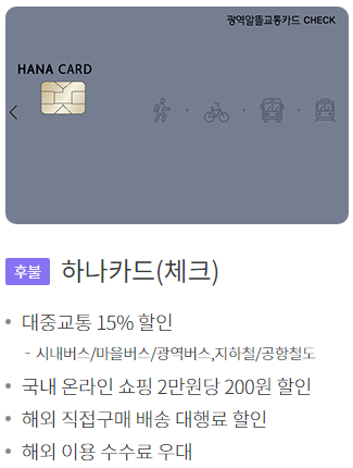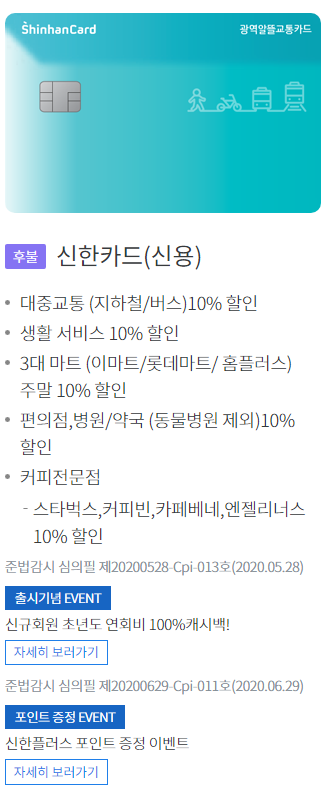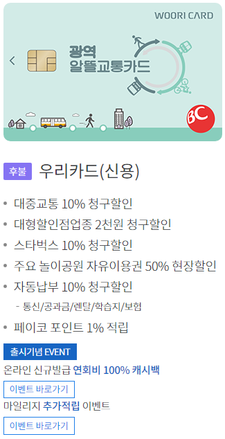 먼저 카드사를 통해 광역 알뜰교통카드 월 10% 할인(후불카드) 혜택을 누릴 수 있습니다.