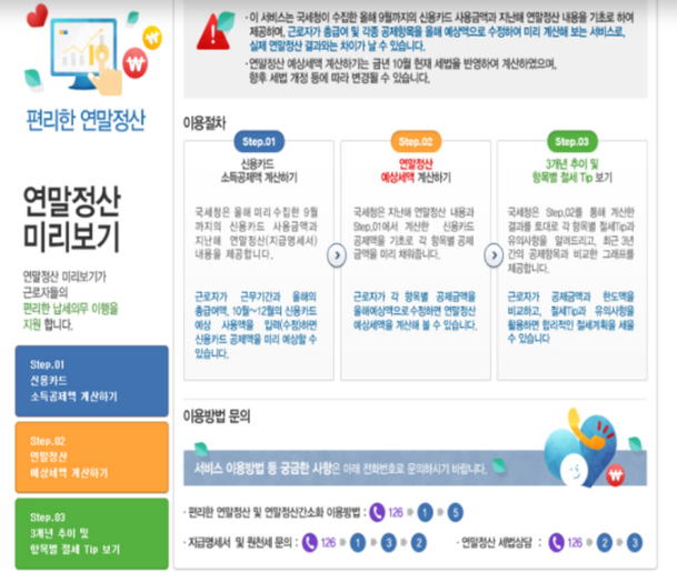 연말정산 미리보기 서비스는 9월까지의 신용카드 사용내역이 제공돼 10월 이후의 지출내역에 따라 달라지는 소득공제액을 계산해볼 수 있습니다.