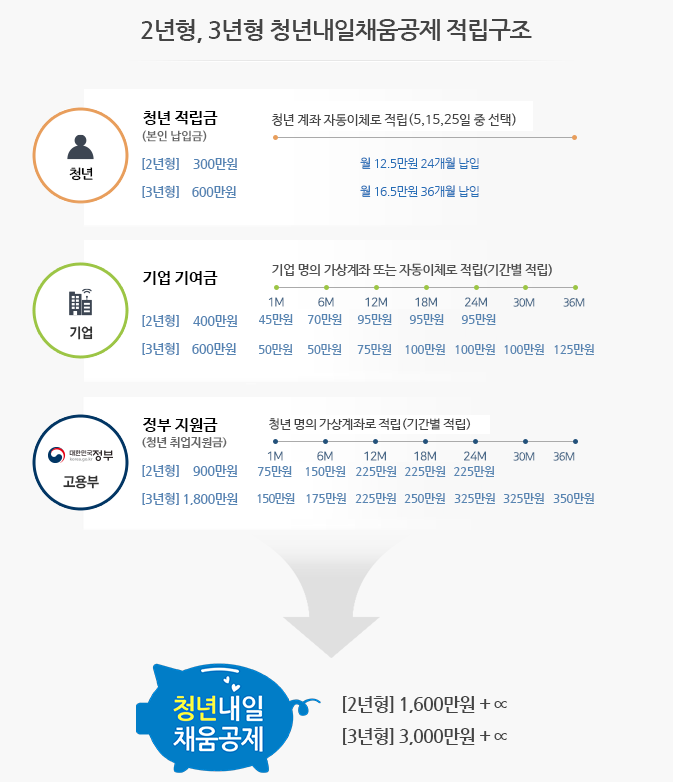 - 청년 본인이 2년간 300만 원(매월 12만 5천 원)을 적립하면 정부(취업지원금 900만 원)와 기업(400만 원, 정부지원) 이 공동 적립하는 방식. -> 2년 후 만기 시 공제금은 1,600만 원+알파가 됩니다.