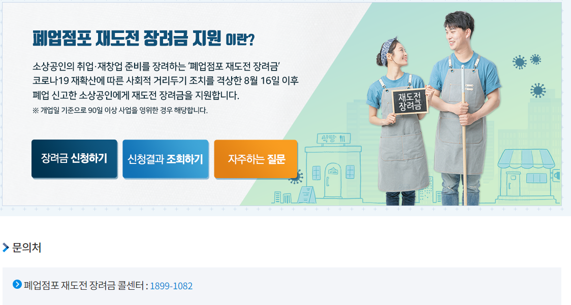폐업점포 재도전 장려금신청 역시 동일 홈페이지에서 가능합니다. 지원 가능 대상 여부도 신청 시 확인이 가능합니다. 온라인 신청에 어려움이 있는 분들은 폐업점포 재도전 장려금신청 전용 콜센터 1899-1082를 통해 안내받을 수 있습니다.